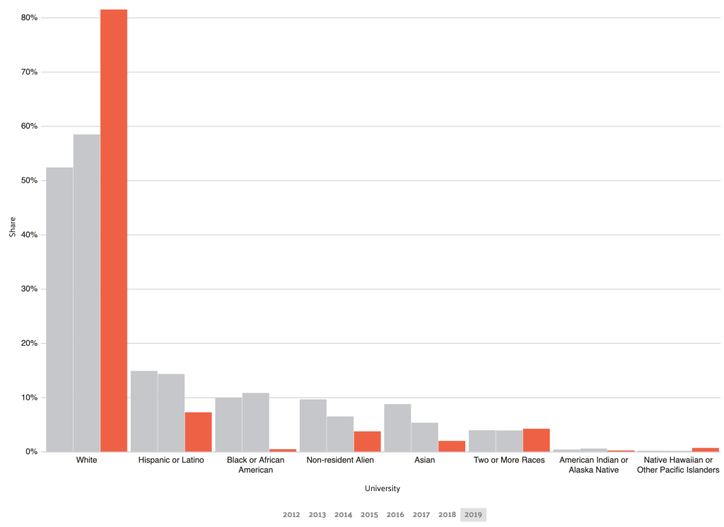 In order to understand how small of a diaspora the Polynesian student body makes at Brigham Young University, we as an audience have to be able to take a step back and look at the numbers. According to a study done by DATA USA in 2019, Pacific Islanders only make up about 0.6% of the student body. Whereas their white counterparts make up a whopping 81% in comparison. From a mathematical standpoint, it is easy to see that Polynesian Students are outnumbered in every way. This also has a butterfly effect of limiting their forms of representation in the classroom, and resources for those who are also experiencing the same types of hardships on-campus that others may not experience.